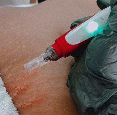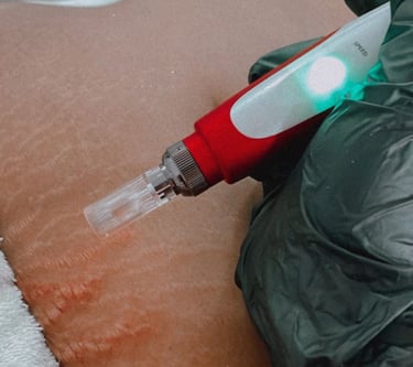 Técnica de camuflaje que iguala el color de la estría con el tono de tu piel. Ideal para: Estrías blancas o plateadas.